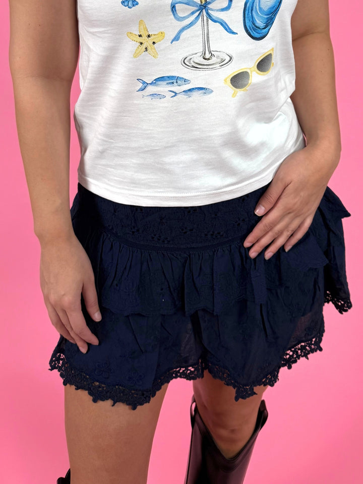 Gemaakt van luchtige broderiestof en dubbel gevoerd (hello no-see-through 🔥). Of je nou naar het park gaat, een terrasje pakt of een festival meepakt, deze skort is always a vibe. Perfect te stylen met een basic tee, cropped top of een oversized sweater.